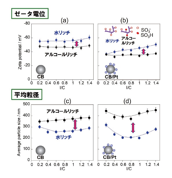 図2 水リッチ(青線)ならびにアルコールリッチ(黒線)溶媒における(a)CBおよび(b)CB/Ptのゼータ電位。水リッチ(青線)ならびにアルコールリッチ(黒線)溶媒における(c)CBおよび(d)CB/Ptの平均粒径。
