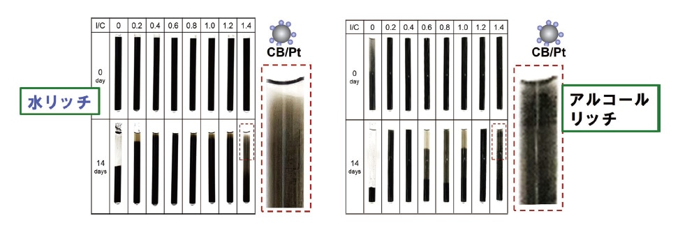 図3 (左)水リッチ溶媒と(右)アルコールリッチ溶媒におけるCB/Ptインクの沈降実験の様子