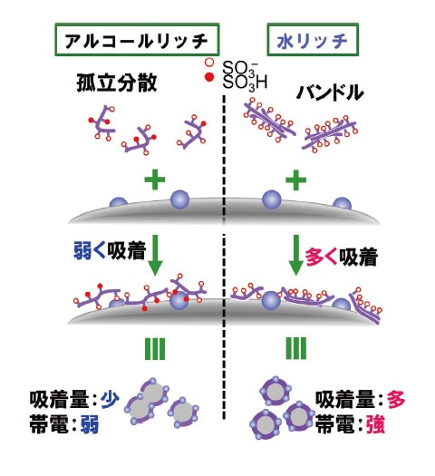 図7 (左)アルコールリッチ溶媒と(右)水リッチ溶媒からの触媒層形成挙動