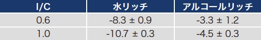 上記の等温吸着測定において、I/Cの増加に伴いナフィオンの吸着量が増加することが明らかになったが、このような変化がCBまたはCB/Ptの分散性にどのように影響するかを調べるために、吸着等温実験と同じインクを用いてゼータ電位、粒径分布および、分散安定性を調べた。ナフィオンが存在しない場合(I/C = 0)、粒子の凝集と沈降が即座に起こるため、ゼータ電位や粒径の測定は困難であった。分散に対するナフィオンの役割が明確に理解できる。一方、図2a,bに示すようにI/C > 0.2ではゼータ電位は負であり、イオン化して負電荷をもつスルホン酸基の効果より安定したコロイド分散が得られたことを明確に示している。ゼータ電位の値はI/C 値に依存せずほぼ一定であった。これは、CBまたはCB/Pt表面では表面吸着したナフィオンとそれを緩く囲むナフィオン層が存在し、吸着等温測定では吸着ナフィオンのみが推定されたのに対し、ゼータ電位測定ではそれより外側まで囲む弱吸着性のナフィオン層表面を捉えていると考えている。ゼータ電位の絶対値が水リッチ溶媒においてより大きいのは、より大きな誘電率によりスルホン酸基のイオン化が進行していることを反映している21)。一方、CB/Ptのゼータ電位の絶対値は、いずれの溶媒においてもCBの絶対値より小さかった(図 2b)。Ptの存在下では、スルホン酸基がPt表面と相互作用し、正味の負電荷が減少したと考察している。