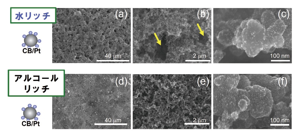 図5 (a ~ c)w-MEAおよび(d ~ f)a-MEAの触媒層表面SEM写真。(a, d)1,300倍、(b, e)20,000倍、(c, f)300,000倍。