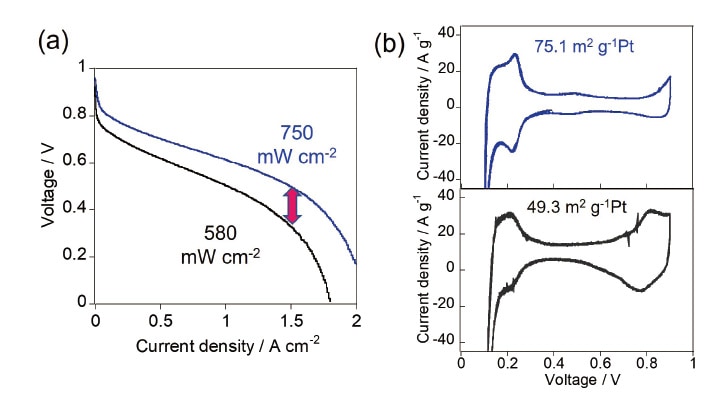 図6 w-MEA(青線)とa-MEA(黒線)の(a)分極曲線および(b)in-situ CV