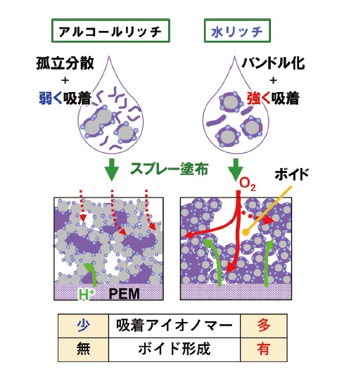 カソードでの酸素還元反応(ORR)では、プロトンの拡散だけでなく、酸素拡散抵抗も関与しており、酸素拡散にはPt表面に吸着したアイオノマー中の拡散と、触媒層内のバルク空間での拡散の両方が影響することが知られている。MEAを用いた交流インピーダンスの解析結果から、w-MEAの方が酸素拡散抵抗も小さいことが明らかとなっている。アルコールリッチ溶媒では、アイオノマーの触媒表面への吸着力が小さいために、触媒層内のバルク空間に溜まることでバルク中の酸素拡散の抵抗になった一方(図7左)、水リッチ溶媒では触媒表面へアイオノマーが強く吸着し、バルクの空孔は保持され、さらにその細孔同士がマイクロボイドで接続されており、バルクの酸素拡散に有利な構造を形成したと考えられる(図7右)。Pt表面上に吸着したアイオノマーは、Pt表面への酸素分子の吸着を抑制することでORRを阻害することも知られているため、重要なファクターである26,44,45)。吸着等温測定で得られた結果からは、水リッチ溶媒中ではアイオノマーはPt表面よりカーボン表面への吸着が有利で、アルコールリッチ溶媒においてはPt表面への吸着が有利であった。しかし、これはインク中における吸着を捉えて考察したに過ぎず、過剰のアイオノマーが存在し、さらに乾燥過程という非平衡な状態を経る中での実際の吸着状態にどのように反映しているかに関しては、触媒層の電気化学的な解析など、より詳細な解析で明らかにしていきたい。