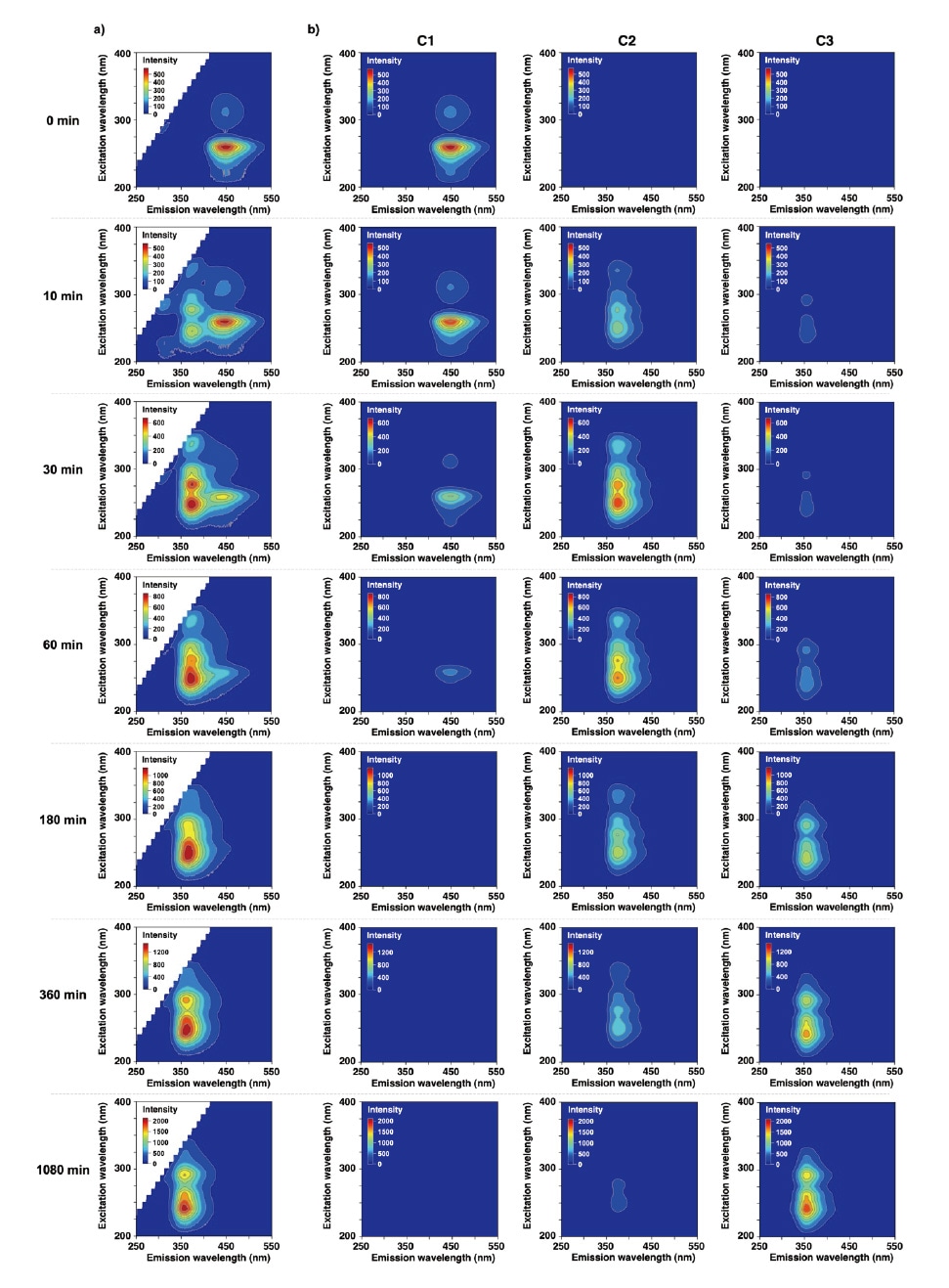 メタノール溶液における1の光分解過程をEEMで経時的にモニタリングした。光照射時間の延長に伴い、1に帰属される蛍光波長(em)450 nm / 励起波長(ex)260 nm、310 nm の等高線マップの強度が減少し、em 300-450 nmとex 200-350 nmの範囲に及ぶ新たな等高線マップが出現した。続いて、PARAFAC解析により成分スペクトルの分離を行った結果、1のem 450 nm/ex 260, 310 nm(C1)の強度が光照射30分で減弱し、em 375 nm/ex 250, 275, 335 nm(C2)とem 355 nm/ex 240, 290 nm(C3)の等高線マップが時間依存的に出現した(図2)。C3はC2より遅れて生成することがわかった。また本EEM-PARAFACモデルのCore consistency(成分数の妥当性を示す指標)は91%を示した。