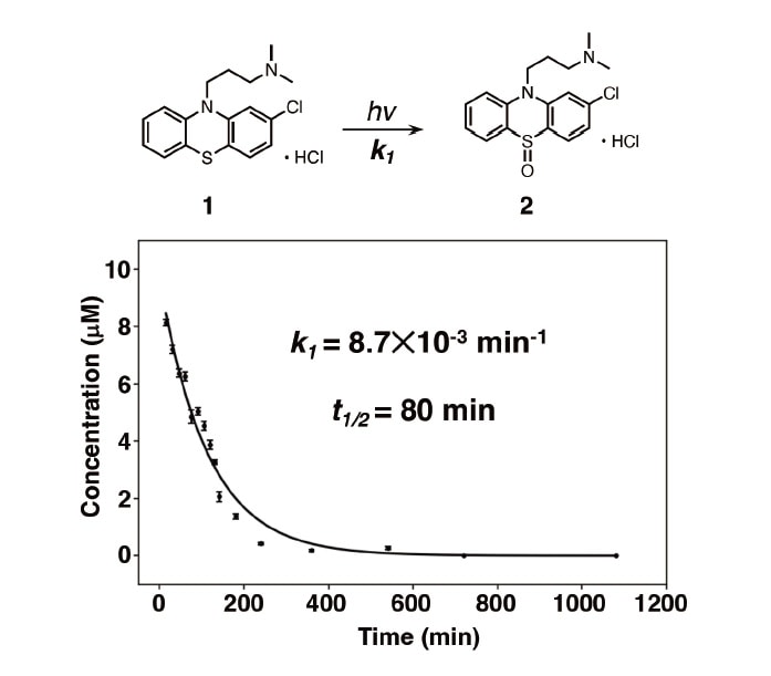 図4は、1の時間−濃度変化曲線を示す。このプロファイルから、1は一次反応に従って分解することがわかった。続いて、式2の速度式を入力したカーブフィッティングプログラムをMatplotlibで作製し、Levenberg-Marquardt法を用いて非線形フィッティングを行った結果、反応速度定数(k1)は、8.7×10-3 min-1を示し、光分解反応の半減期(t1/2)は80分となった。