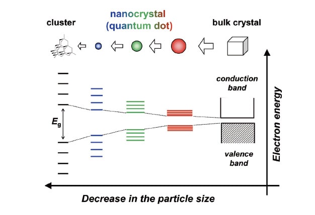 “量子ドット”とは、電子が非常に小さな空間に三次元的に閉じ込められ、量子閉じ込め効果を受けた状態を指す用語であり、近年では特に、10 nm 以下の大きさの半導体ナノ結晶を示すことが多い。バルク半導体では、電子エネルギー準位が帯状のバンド構造(価電子帯、伝導帯)をもつのに対し、量子閉じ込め効果を受けた半導体ナノ結晶は、離散的な電子準位となり連続的なバンド構造は消失する。量子閉じ込め効果の程度は粒子サイズによって変化するために、量子ドットのサイズが減少すると、伝導帯下端の準位がより負電位側に、価電子帯上端の準位がより正電位側にシフトし、エネルギーギャップ(Eg)が増大する(図1)。これにより量子ドットの吸収スペクトルは、粒子サイズの減少とともに短波長シフトする。このようなナノサイズ化による半導体の光学特性の変化は、“量子サイズ効果”と呼ばれる。これを利用すると、構成する物質を変化させなくともサイズを変化させることのみで、量子ドットの電子エネルギー構造が制御できる。このようなサイズに依存して大きく変化する量子ドットの光・電子特性は、数多くの研究者を魅了し、活発な研究分野になっている。