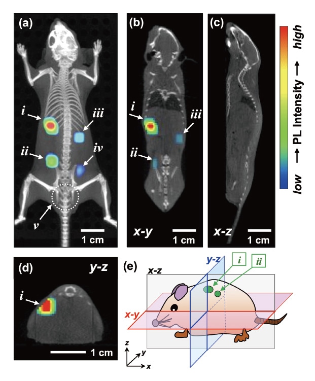 図5 (a-d) Ag-In-Ga-Se量子ドットを皮下注射したマウスの三次元近赤外発光イメージング。画像はマウスのX線CT画像とPL像とを重ね合わせたもの。(e)マウスの画像撮影の模式図。