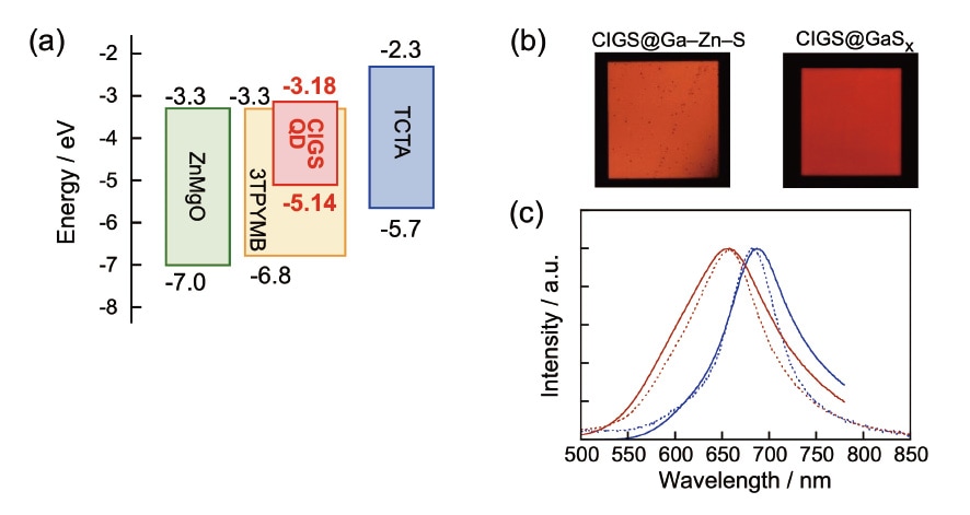 図6 (a) Cu-In-Ga-S(CIGS)量子ドットを発光層に用いるEL素子の構造模式図、(b)駆動時のEL素子の写真、および(c)ELスペクトル(実線)とPLスペクトル(破線)(CIGS@Ga–Zn–S(赤)およびCIGS@GaSx(青))。文献15)より許可を得て転載。Ⓒ2023 AIP Publishing