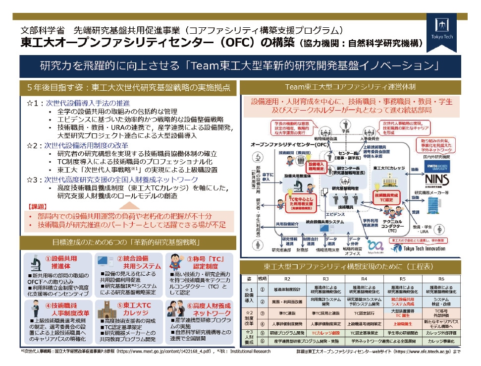 東京工業大学は、我が国の状況に先んじて国立大学法人の新たな経営改革にチャレンジしており、令和元年度(2019年度)には文部科学省国立大学経営改革促進事業に採択され、「次世代人事戦略」をはじめとした斬新な制度改革、技術職員を中核とした先進的な組織改革として「オープンファシリティセンター(以下、OFC)」の設立等を実施してきました5)。特に、図1に示すOFCを中心とした設備の統合管理と高度技術専門人財養成の2次元的強化は、東工大の次世代研究基盤戦略として全国的にも類を見ない新たな戦略として注目されてきました。