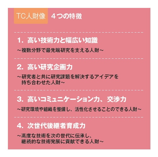 図3はTC人財像の4つの特徴を示しています。TCを有する技術職員等は、技術職員等に求められる「高い技術」はもちろんのこと、「幅広い知識」、「高いコミュニケーション力」、「技術の伝承」、さらに「組織運営」などの能力を、大学として正式に評価する指標となるものとしています。TCは、研究基盤に関する高度専門人財として、また、技術職員等の指導的立場として、組織の研究力向上やレベルアップに貢献することが期待されています(図4)。