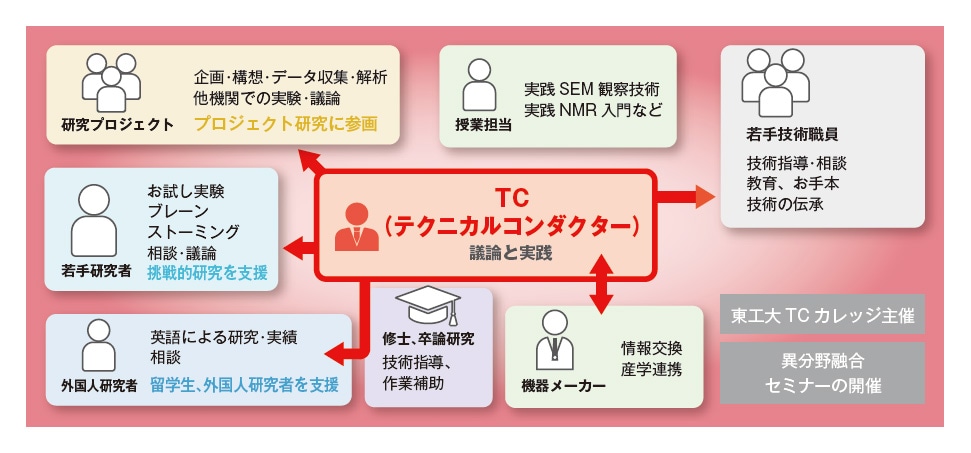 東京工業大学では、高い技術力・研究企画力を持つ高度専門人財を「テクニカルコンダクター(以下、TC)」として認定する称号制度を設立しました。TC制度における研究企画力は、研究支援企画力も含めた幅広い意味を持っています。研究者の研究力向上に資する技術職員等の新たなあり方として、研究者がどのように研究企画を行なっているかを理解し、TC認定された職員等は、将来研究者の研究企画に対して示唆を与えられるような人財になることを想定しています。