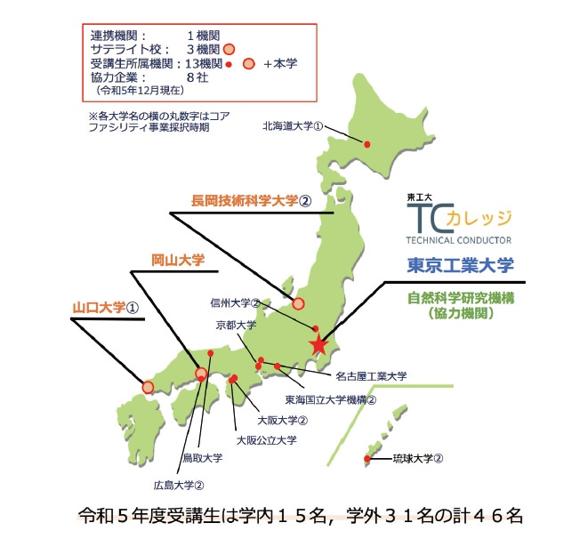 TCカレッジは、2021年に東工大OFCに設置され、1年目(2021年)は東工大学内限定、2年目(2022年)には企業を含む学外者を受け入れ、これまでに大学民間企業を合わせて全国から計16機関55名が入学し、テクニカルマスター(以下、TM(Technical Master))取得者29名、TC取得者5名、2024年3月現在16機関46名が在籍している事業に成長しました(図5)。2024年3月現在9コースが設置されており、連携機関として、長岡技術科学大、岡山大、山口大がサテライト校として、自然科学研究機構が協力機関として、日本電子株式会社、株式会社島津製作所、株式会社日立ハイテクをはじめ8機関が協力企業として参画しています。