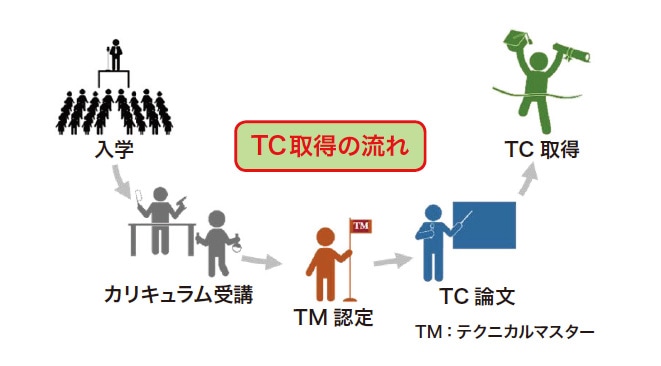 図6はTC取得までの流れを簡易的に示した図になります。TCカレッジは、原則3年間で修了するよう設計されており、入学し、カリキュラムを受講し、必要な単位数を取得するとTMとなり、その後、TC論文を執筆し、TC論文審査会での審議を経て合格となればTCの称号付与という流れになっています。TMは、全国の研究機関等における標準的な指標となることを念頭に、技術職員等のこれまでの経験等を含め評価する最新の仕組みとなっています。現在、民間企業からの受講生の実情に合わせた改良も進んでおり、全国の技術者にとって有意義な称号とするために尽力しているところです。