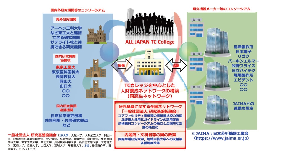 これらの最先端の戦略を元に、令和2年度(2020年度)に文部科学省先端研究基盤共用促進事業コアファシリティ構築支援プログラムに採択され、高度技術専門人財養成のシステムとして、オールジャパンで挑む産学官協働人財養成プロジェクト「TCカレッジ」を推進することとなりました(図2)。