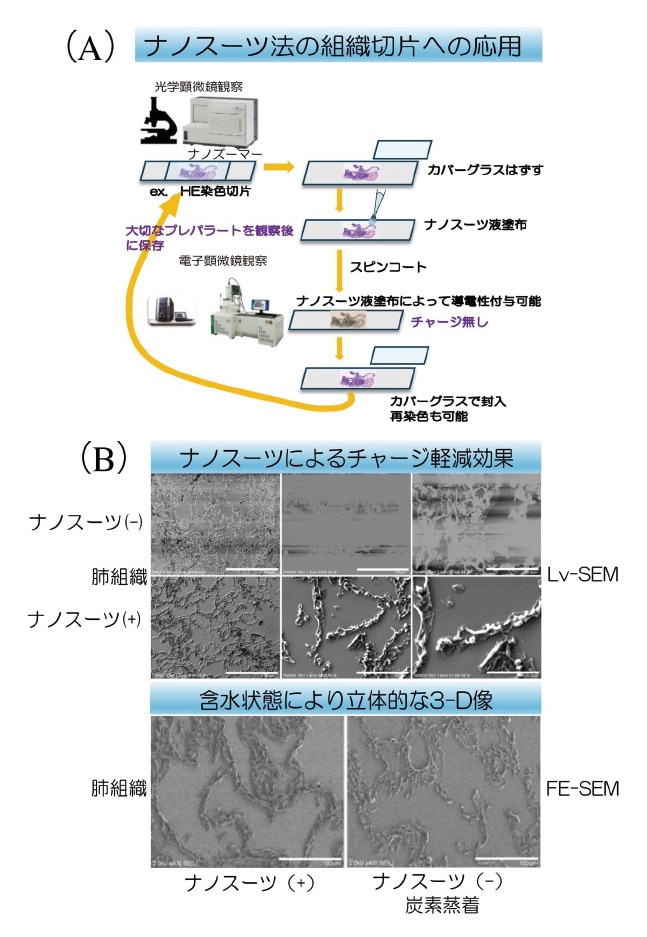 病理診断では光学顕微鏡で同定した部位をより高倍で観察する必要が生じることがあり、最近では超解像蛍光顕微鏡を使用して大腸癌5)や乳癌6)のFFPE切片解析の報告がある。しかしこの方法は蛍光染色が必須の条件のため一般のHE染色切片には応用できない。そのために超高倍率の観察には電子顕微鏡は不可欠なツールである。最近ではLV-SEMを利用して、腎臓を中心としたパラフィン切片の解析が行われるようになり、腎生検LV-SEM研究会での活発な議論がなされている。従来法では、既存のHE染色組織切片をそのままSEM観察することは通常なく、連続切片を金・炭素・オスミウム蒸着処理し導電性付与後に不可逆的に電子顕微鏡観察する。通常の蒸着処理では切片が完全に乾燥してしまい本来の含水状態の組織構築は失われてしまう。更に一度蒸着・乾燥した切片にHE再染色すると色合いが変化してしまい、元の状態に戻すことが困難であった。しかし、ナノスーツ液を利用することで、これらの問題を解決する糸口が開かれた。