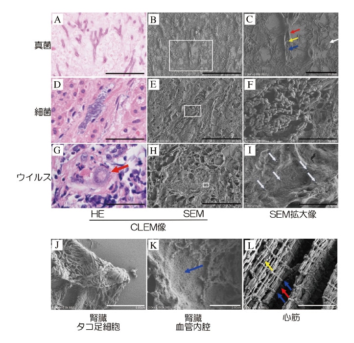 A-C:肺アスペルギルス、A: HE像、B:AのCLEM-SEM像、C:B□部分を拡大SEM像、白矢印:胞子、赤矢印:細胞壁、青矢印:隔壁、黄矢印:核。D-F:細菌(Aeromonas hydrophila)、D: HE像、E:DのCLEMSEM像、F:E□部分を拡大SEM像。G-I:サイトメガロウイルス(CMV)、G: CMV巨細胞封入体HE像(赤矢印)、H:GのCLEM-SEM像、I:H□部分を拡大SEM像、CMV粒子(白矢印)。J:腎臓糸球体タコ足細胞。K:腎臓血管内皮表面、青矢印陥凹部。L:心筋の組織微細構造像、M line(赤矢印)、Z line(青矢印)、ミトコンドリア(黄矢印)。Lab Invest. 2020;100(1):161-173.の図を改変。CC-BY-4.0の下で使用2)。