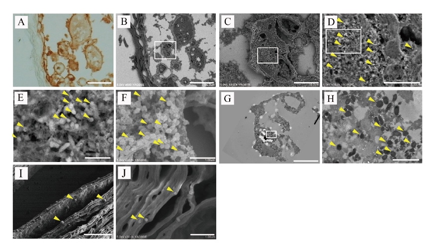 我々の研究室はFFPE切片におけるHuman papilloma virus9, 10), CMV9), Varicella-Zoster virus(VZV)9), SARSCoV-2(unpublished)のウイルス粒子構成蛋白に対して免疫染色を行いDAB発色をおこなった。その後2% OsO4をDABと反応させ、FE-SEMでDAB/OsO4陽性部位を観察した。図3にはVZVウイルス粒子の観察例を示す。VZV感染患者の皮膚水疱病変部および表皮下領域にVZV抗原陽性(DAB陽性)となった(図3A)。ナノスーツ-CLEM法を用いたSEM観察ではDAB/OsO4領域がBSE modeで白色領域として強調された(図3B)。拡大された領域には複数の白い点のスポットが見られ(図3C)、拡大画像には複数の粒子(矢頭)(図3D、E)が含まれていた。DAB/OsO4染色陰性領域にはウイルス粒子様構造は見られなかった。形状、直径(150-200 nm)、および電子増強信号(矢頭)の特徴からVZV粒子と判断された。オスミウムコートでもVZV粒子(矢頭)は描出されたが、ややコントラストが低いことが示された(図3F)。図3Cに対応するCLEM-TEM画像には複数のVZV粒子が観察される(図3G、H)。また水疱上皮表面にも、複数の孤立したVZV粒子(矢頭)が二次電子モード(図3I)で見られると同時に、BSEモード(図3J)でもDAB/OsO4で強調されたVZV粒子が見られた(矢頭)9)。