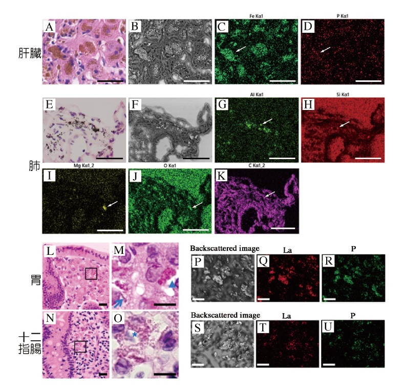A:沈着部位(褐色)、HE染色。B:AのCLEM-SEM像(反射電子(BSE)モード)。C:鉄(白矢印)。D:P(リン)(白矢印)。E-K:肺の炭粉沈着症患者、E:HE染色、F:EのCLEM-SEM像(BSEモード)、G:アルミニウム(Al)(白矢印)、H:ケイ素(Si)(白矢印)、I:マグネシウム(Mg)(白矢印)、J:酸素(O)(白矢印)、K:炭素(C)(白矢印)。Lab Invest. 2020;100(1):161-173.の図を改変。CC-BY-4.0の下で使用2)。L-U:消化管におけるリン酸ランタン沈着。L, M:胃HE染色。N, O:十二指腸HE染色:褐色の粒状(*)、針状(矢印)、または無定形構造を示す沈着(Δ)。P, S:異物沈着部位SEM像(BSEモード)。Q, T:La(ランタン)。R, U:P(リン)。Diagnostics(Basel). 2019;10(1),1の図を改変。CC-BY4.0の下で使用12)。