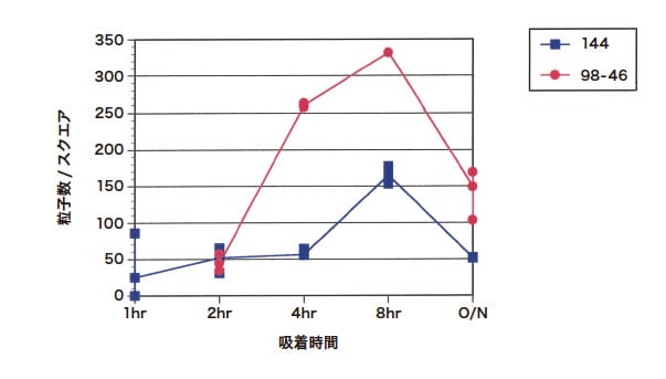 電顕法は視野にウイルスが存在していれば、非常に迅速に結果を得ることができる。その一方で、小型な粒子や粒子数が少ない場合は検出が困難な場合がある。そこで、通常は3分程度であるウイルス浮遊液のグリッドへの吸着時間を検討したことがある。結果はチャンバー内で8時間をピークとし、それ以上は減少した(図1)。実施検討数が少ないが、粒子数が少ない場合は効果が期待できるかもしれない。