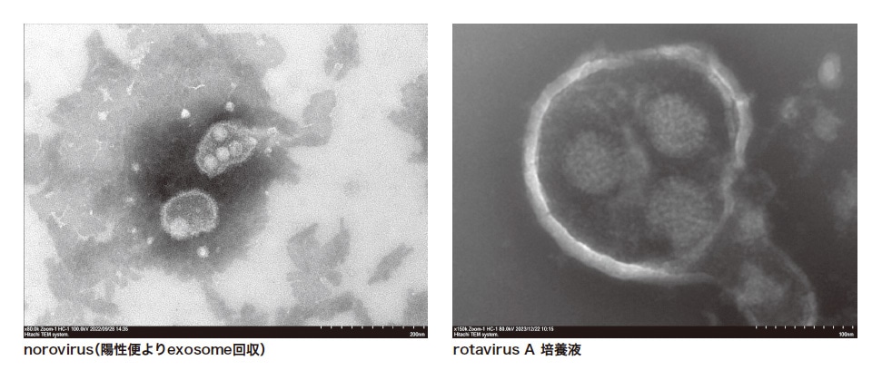 下水にはこれまでのウイルス濃縮法とは異なる手法を用いているが、ロタウイルスやノロウイルスの陽性便におけるウイルス観察にも新たな発見が報告された3)。それは感染者の便からexosomeを回収すると、その中に数個のウイルスが存在している(vesicle)というもので、このような構造物が環境抵抗性や感染効率に関連していると推察されている。当所においてもexosome回収法を用い、ノロウイルス陽性便中のvesicle観察が再現できた(図5)。ウイルスの動態を明らかにする上で電顕法は必要と考えられる。