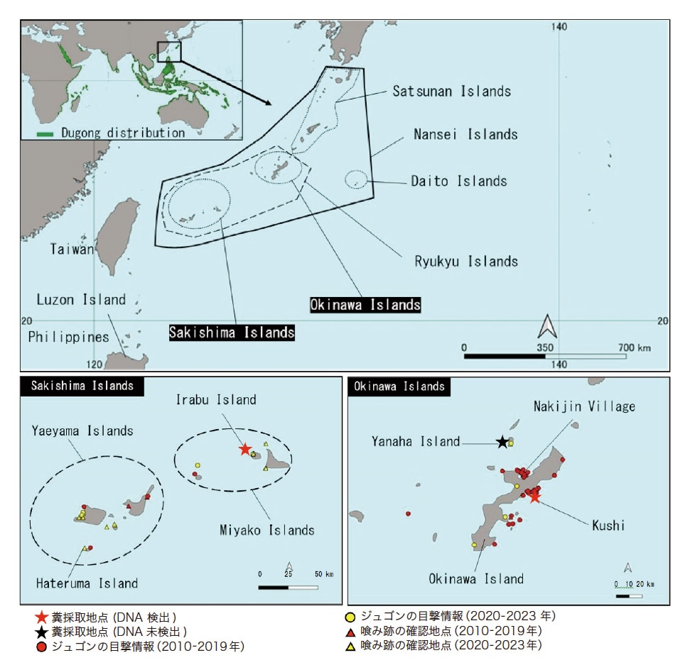 ここでは、2022年より新たなジュゴンの生息域の特定に向けた調査手法として野外で採集したジュゴンと思われる糞からのDNA抽出による取り組みに関して、2024年に公開した沖縄県内(伊良部島及び沖縄島)で採取された糞からのジュゴンのDNAの確認に関する論文をベースに紹介する4)。