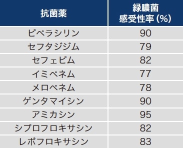 感染症診療で抗菌薬を決定するまでには、まず①感染症であるかどうか吟味する。発熱のみで感染症と診断することはできず、薬剤熱、膠原病、悪性リンパ腫、血栓塞栓症、脱水などを注意深く除外する必要がある。感染症の場合、次に②感染臓器はどこか推定する。感染臓器により原因菌の頻度が異なるため、感染臓器が判明することで、③原因菌を想定することができる。さらに、年齢、基礎疾患、院内か市中かなど感染症に罹患した場所によっても想定される原因菌が絞られる。ターゲットとなる原因菌が想定できれば、④感受性がある抗菌薬を選択する。各種抗菌薬の抗菌スペクトルから、想定される菌に抗菌活性を有し、アンチバイオグラムで感受性が高いものの中から患者背景、抗菌スペクトルの広さ、相互作用などを考慮し選択する。アンチバイオグラムの例として緑膿菌に対するある施設の感受性率を表1に示す。この施設ではカルバペネム系薬の感受性率が低く、治療失敗のリスクが高いため、緑膿菌を想定する場合は、カルバペネム系薬以外を選択する。