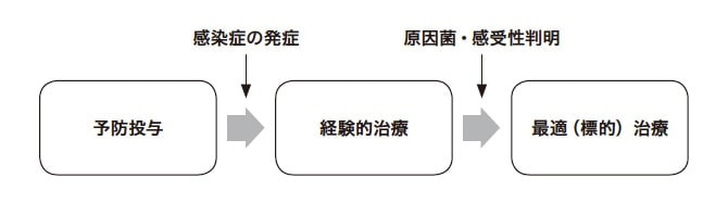 抗菌薬は使用する時間でその治療法の名称が異なる(図2)。予防投与は、感染症には罹患していないが、将来的に発生する可能性のある感染症を予防するための投与である(代表例:手術前投与)。感染症が発症したら上述の①~④の流れで原因菌を想定し抗菌薬を選択する。この原因菌の確定および感受性結果が不明の状態のときの抗菌薬投与を経験的治療と呼ぶ(培養結果待ちの状態での抗菌薬投与)。培養の結果により原因菌が確定し、感受性結果が判明した後に抗菌薬を投与する場合を最適(標的)治療という。