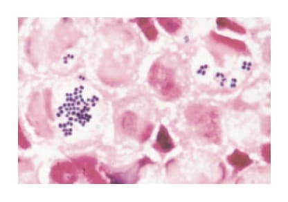 検体採取から原因菌および感受性が判明するまで3日間を要する(表2)。想定された原因菌に対して経験的治療を始めるが、グラム染色(15分程度)を実施することで、さらに原因菌は絞られる。図3はグラム染色であり、貪食されたグラム陽性球菌を見ることができる。さらに、細菌がブドウのように見えるためブドウ球菌であることが分かる。原因菌の同定、薬剤感受性の判明までは至らないものの、ブドウ球菌であることが分かるため、セファゾリンまたはバンコマイシンの投与を推奨することができる。