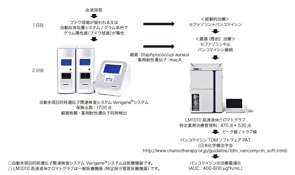 TDM対象抗菌薬の血中濃度測定日と目標値を表4に示す。TDM対象薬の中で2021年以降、その指標がかわるものとしてバンコマイシンがある。PK/PDの観点からバンコマイシンの有効性・安全性の両者と最も相関するパラメータはAUCであり、その目標値は400-600 μg*h/mLと設定されている5)。これまで実臨床ではAUCの代替指標としてトラフ値が用いられてきた。しかし近年、トラフ値とAUCの関係が見直され、トラフ値のみの測定ではAUCを正しく評価できないことが報告され、AUCを正確に算出するためにはピーク値とトラフ値の2 ポイントの測定が必要であることが示された6,7)。ピーク値は分布容積さらにトラフ値との差により半減期を規定しており、AUCを算出する上で重要な因子である。したがって、バンコマイシンの有効性・安全性はAUCで評価し、その目標値は400-600 μg*h/mLであり、正確にAUCを評価するためにはピーク値とトラフ値の2ポイントが必要である。このことに伴い、AUCに基づいて投与設計ができるソフトウェア(Practical AUCguided TDM for vancomycin:PAT)が開発された。血中濃度測定はソフトウェアを使用することを前提に定常状態前の3回投与時に実施する。1日2回投与の場合は翌日となる。図4に示すように、血液採取の翌日にVerigene®システムによりバンコマイシンの継続が決まれば、LM1010高速液体クロマトグラフで血中濃度を測定し、PATを用いて目標AUCに入るように投与設計を行い、バンコマイシンの治療最適化を目指す。血液培養検査と異なり、Verigene®システムの場合は翌日に耐性菌かどうか判明するので、もしmecAが検出されなければバンコマイシンは中止となり、血中濃度測定も実施する必要はなくなり、業務の負担も減る。