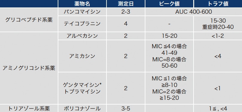 *グラム陽性菌に対する併用治療時はピーク値3-4 μg/mL、トラフ値<1 μg/mLを目標とする。