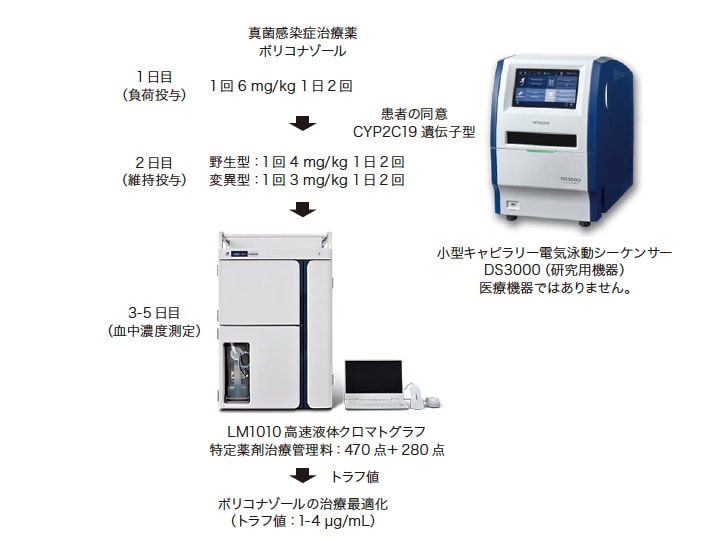 血中濃度測定日は治療開始3-5日目で目標トラフ値は1-4 μg/mLと設定されている(表4)。ボリコナゾールの用法・用量は、初日は負荷投与として1回6 mg/kgで1日2回、2日目以降は維持投与として1回3-4 mg/kgで1日2回投与となっている。我々は母集団薬物動態解析を行い、トラフ濃度が2-4 μg/mLとなる維持量を検討した9)。その結果、CYP2C19野生型では1回3.6-4.5 mg/kg、変異型では2.2-3.3 mg/kgが推奨された。したがって、野生型が多い米国人では1回4 mg/kgの投与でも安全に使用できるが、変異型が多い日本人では1回3 mg/kgの投与が安全に使用するための目安と考えられた。しかし、重症感染症時は早期の治療が重要であるため治療失敗を避けるためには、野生型を考慮し1回4 mg/kgを維持量として投与する。このようなときに患者の同意のもと遺伝子多型解析ができれば、患者に最適な医療を提供できる。小型キャピラリー電気泳動シーケンサーDS3000は8時間程度でCYP2C19の遺伝子検査結果がでるため、ボリコナゾール投与開始日に遺伝子検査を行えば、2日目の維持量投与から、野生型は1回4 mg/kg、変異型は1回3 mg/kgの投与が可能となる(図5)。その後、投与開始3-5日目に血中濃度測定が実施される。ボリコナゾールはほとんどの施設で外注検査となっており、血中濃度の結果を得るまでに、投与開始から考えると1週間以上かかる。前もって遺伝子多型解析を実施し、その結果に基づいて投与設計ができていれば、安全にボリコナゾールを使用できる。また、LM1010高速液体クロマトグラフの最大の利点の一つとしてボリコナゾールの測定ができることが挙げられる。所有しておけば、その日のうちに測定結果が得られるため、検査結果で患者状態の悪化や肝障害の発現が見られたら、3-5日まで待たず、すぐに血中濃度を確認し、ボリコナゾールの増量または減量、他剤への変更をその日のうちに決められ、ボリコナゾールの治療最適化に貢献できる。