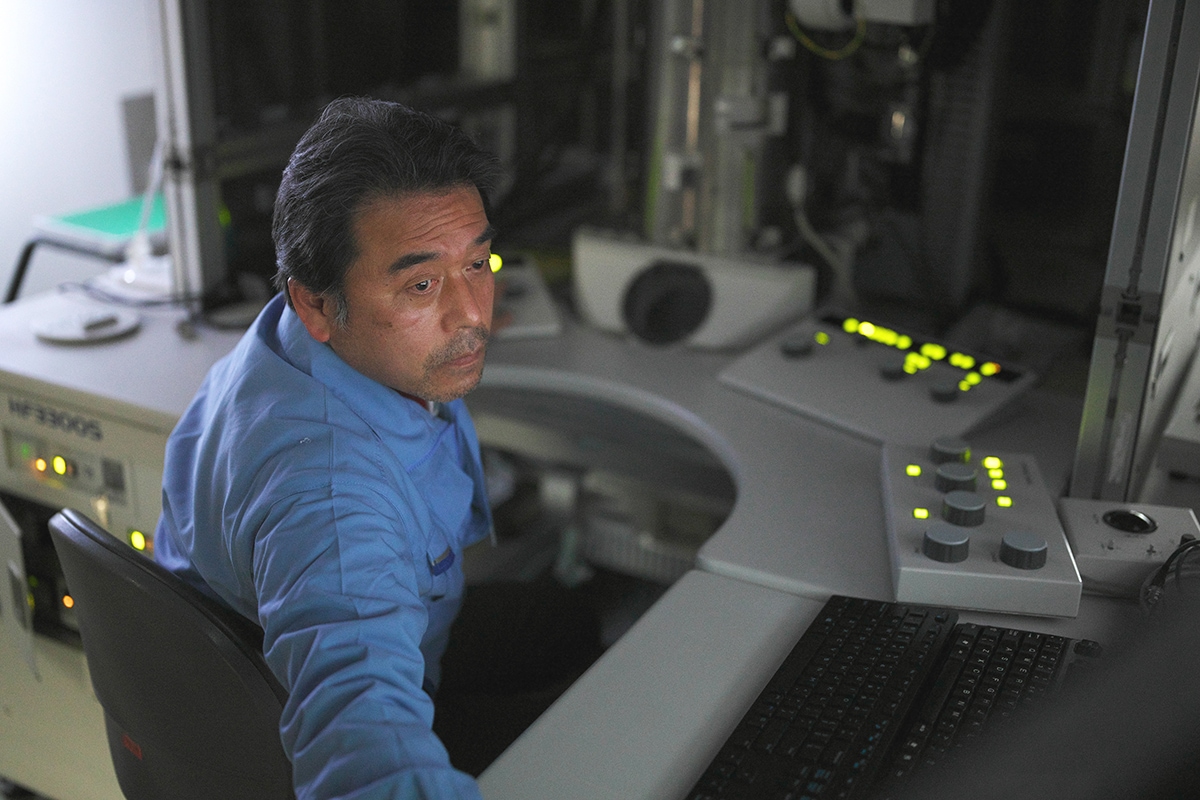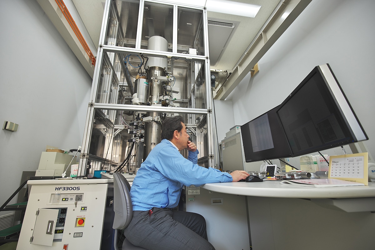 日立透過電子顕微鏡「HF-3300S」を操作する原田氏。照明を落とした部屋で観察画像を見つめる氏の眼差しは鋭い。