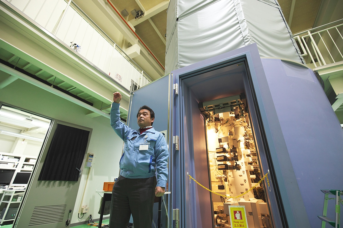 1 MV ホログラフィー電子顕微鏡の前で。この顕微鏡設置に最適な場所として、外村氏が日本中の地質と環境から選び抜いたのがここ、鳩山町だ。非常に硬いとされる岩盤の上に設置されている。