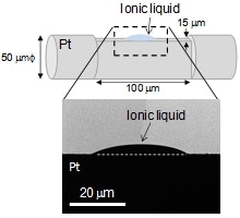 電子線照射によりイオン液体の電位が増加することが明らかになったが、このような変化はイオン液体の表面物性に影響すると考えられる。そこでNB5000 FIB-SEMに搭載されているマイクロプローブを用いてイオン液体の表面状態の確認を行った。図3は電子線照射を行っていないイオン液体と電子線束密度2 × 1017 e/m2sで3時間電子線照射を行った後のイオン液体のプローブ接触後におけるSEM像である。電子線を行っていないイオン液体はプローブが触れると、試料がプローブに付着しており、液体状態であることが確認できる。一方、電子線照射を行ったイオン液体はプローブが接触してもその形状は変化せず、固体状態であることがわかった。以上より電子線照射によりイオン液体が帯電し、固体化するということが明らかになった。今後、イオン液体を電子顕微鏡に応用するためには、固体化が起こらない適切な観察条件の検討や固体化のメカニズム解明を行っていく必要がある。