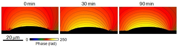 イオン液体はFIBで加工した白金線上に保持し(図1)、HF-3300形TEMを用いて加速電圧300 kVで同一視野のホログラムを撮影しながら、電子線照射による外部電位の時間変化を観察した。図2は電子線束密度2 × 1017 e/m2sで電子線照射を行ったイオン液体の位相再生像の観察開始直後から90分間の時間変化である。電子線開始直後にもイオン液体を中心として周辺の位相分布が観察されており、イオン液体は電子線開始直後から微小な電位を持ち、プラスに帯電していることがわかる。照射時間が進むにつれて位相分布の変化が大きくなり、帯電量が増加するが、90分照射後もTEM観察には影響しない程度の帯電量である。このような微小な電位変化は通常のTEM観察やローレンツ観察での検出は難しく、電子線ホログラフィーを用いて初めて評価することができた。