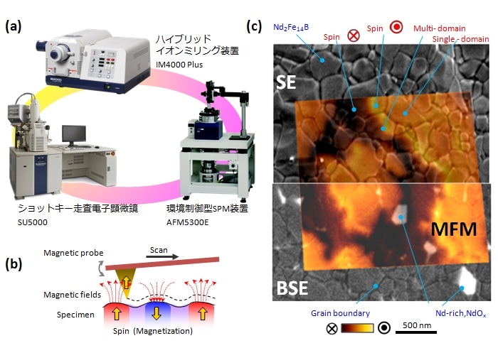 (a)今回使用した装置 (b)MFM(磁気力顕微鏡) (c)Dy フリー熱間加工Nd-Fe-B 永久磁石への適用例
