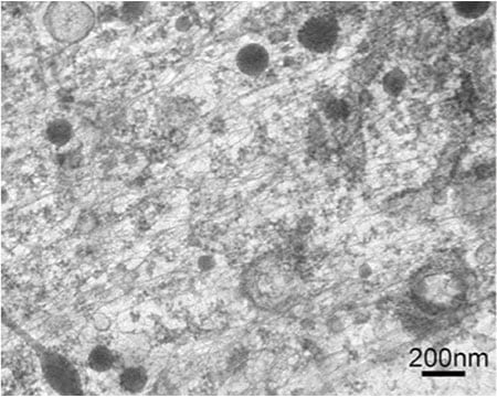 アクチン線維や微小管からなる細胞骨格に加え、粗面小胞体、滑面小胞体、リボソームなどが観察される。