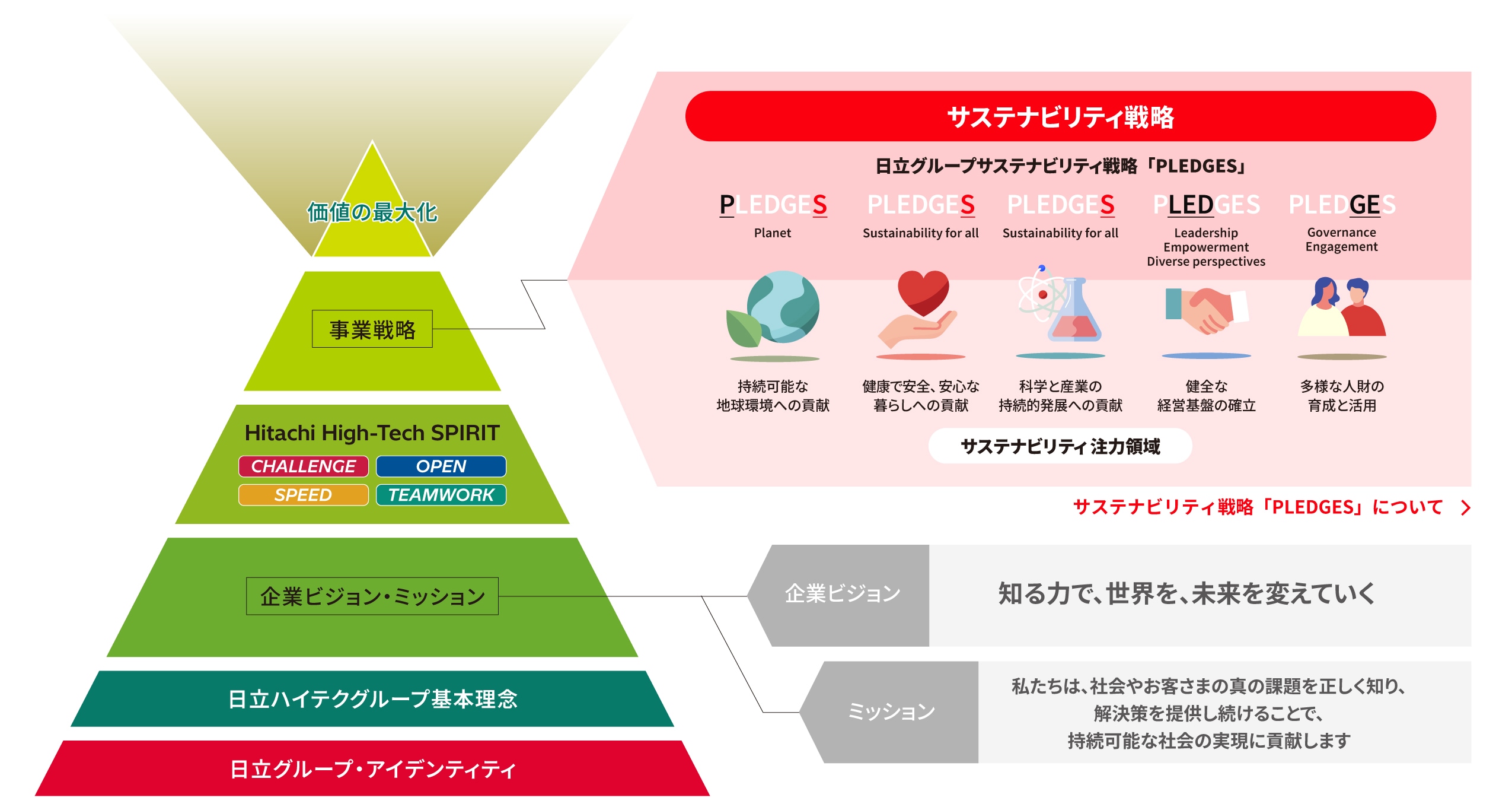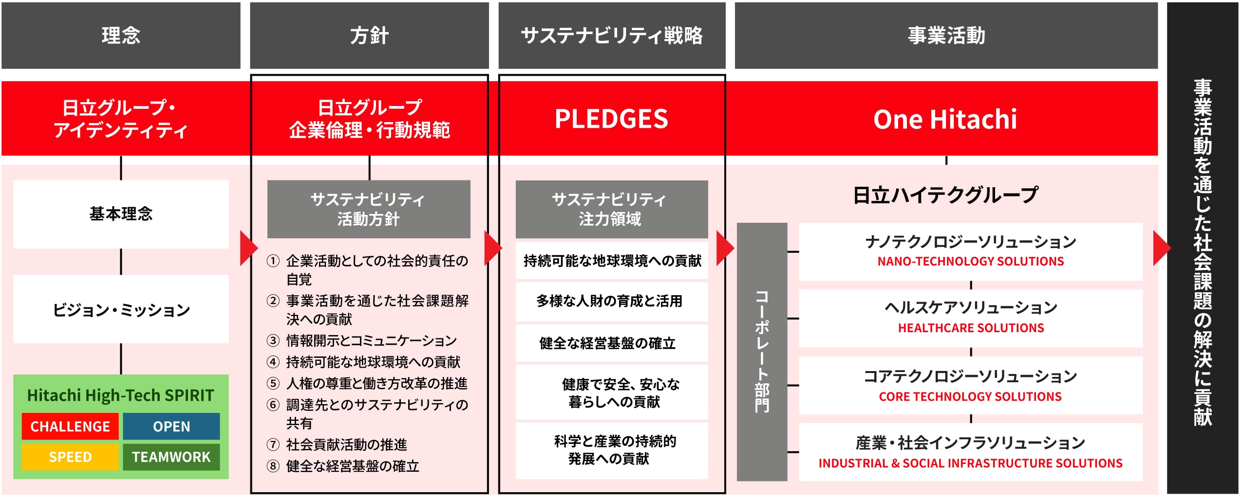 当社グループは、「日立グループアイデンティティ」や基本理念、ビジョンの実現に向けて、「日立グループ企業倫理・行動規範」および「サステナビリティ活動方針」に基づく活動を推進しています。さらに、活動を加速させるために日立グループサステナビリティ戦略「PLEDGES」および当社の「サステナビリティ注力領域」を指針として、事業活動全体での価値創出と社会課題の解決に取り組んでいます。
