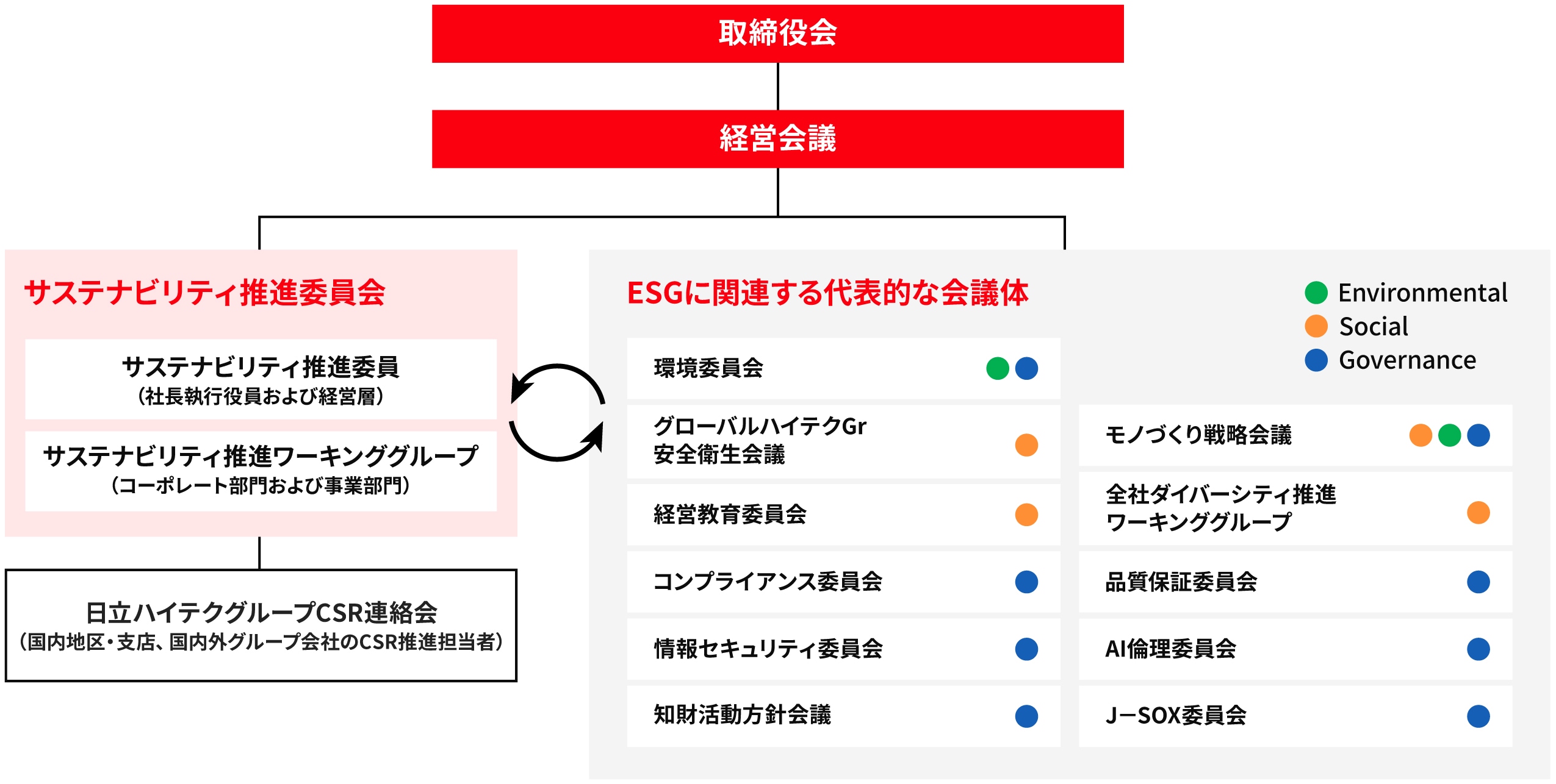日立ハイテクグループでは、サステナビリティ活動を推進するため、社長執行役員を議長とする「サステナビリティ推進委員会」を年2回以上開催しています。委員会では、課題や施策の進捗を確認し、必要な対応を協議します。重要事項は年1回、取締役会に報告し、そのフィードバックをサステナビリティ推進業務に反映させ、PDCAサイクルを取り入れた活動を展開しています。