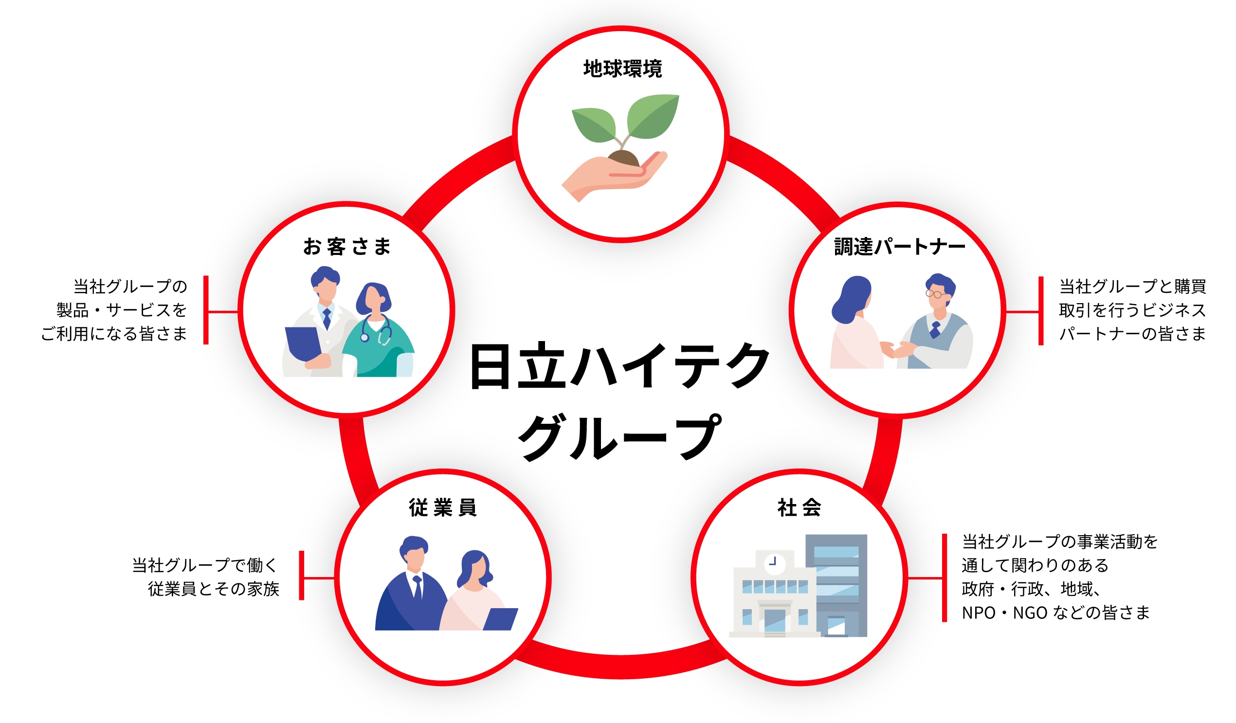 日立ハイテクグループは、「お客さま」「調達パートナー」「従業員」「地域コミュニティ」など、さまざまなステークホルダーとの双方向の対話を重視しています。こうした対話を通じて要請や期待を的確に把握し、本業を通じて新たな価値を創出するとともに、持続可能な社会の実現に向けたサステナビリティ活動を推進していきます。