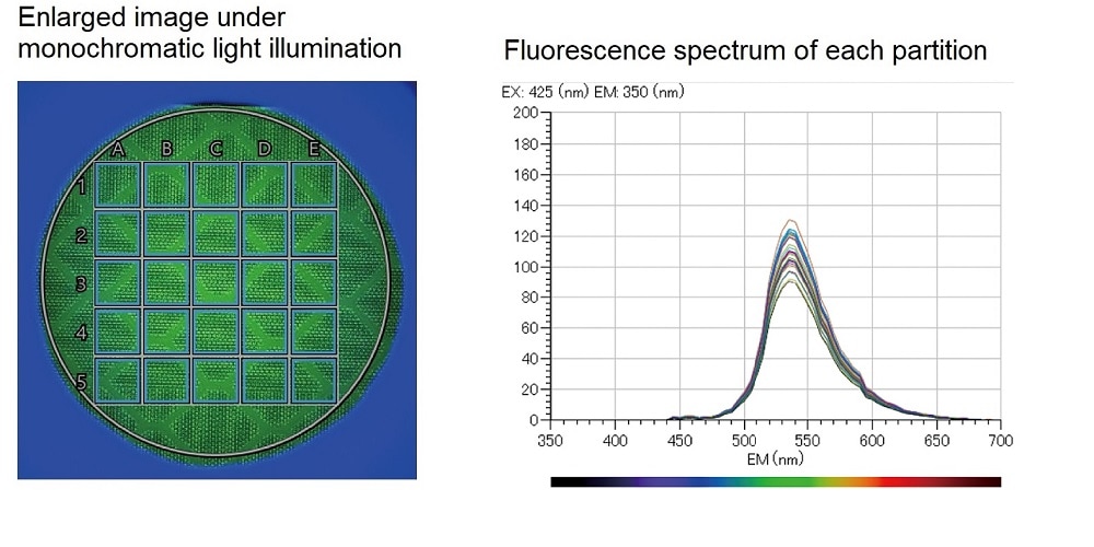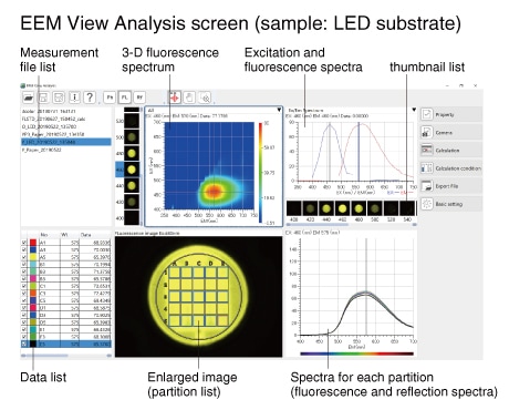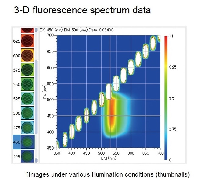 시료에 입사 광선으로 360 nm ~ 700 nm및 백색광을 조사 합니다. 이 때, 각 조명 조건에 따라 화상을 취득함과 동시에, 형광 쪽 분광기로 형광 스펙트럼을 취득합니다. 측정 후에는 3 차원 형광 스펙트럼 (여기 파장, 형광 파장, 형광 강도)이 표시 됩니다. 전용 해석 소프트웨어에서는 화상의 확대 보기 및 구획 별 형광/반사 스펙트럼의 보기가 가능합니다. 면 내에서 불균일은 시료의 반사 및 형광 분포를 화상 및 스펙트럼으로 간주될 수 있습니다.