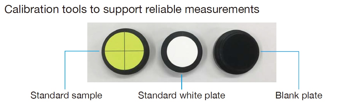 - 제공된 표준 백판 (100%)와 브랭크 판 (0%)을 이용하여 보정을 수행 합니다. 형광 강도 및 반사율의 교정, 그리고 화상에 따른 면 내의 휘도 분포의 보정에 사용 됩니다.