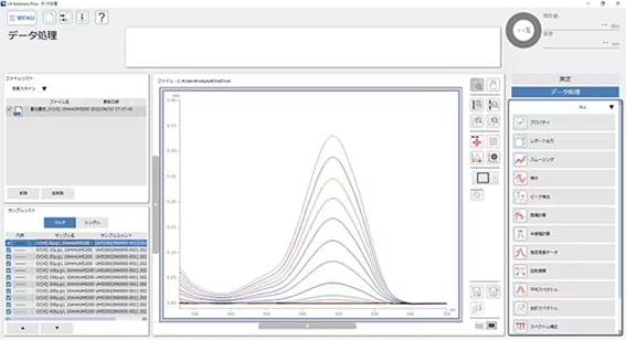 UH5210(PC 제어 모델)에서는 새로운 데이터 처리 소프트웨어 UV Solutions Plus를 채용해, 쾌적한 조작 환경을 실현했습니다. 호평을 받고 있는 UV Solutions와 비교해, 데이터 리스트나 데이터 처리 결과의 표 형식 표시 기능, 리포트 레이아웃 기능, 성능 확인 기능 등을 사용할 수 있습니다. UH5200에는 옵션 UV Solutions Plus 소프트웨어로 PC 제어가 가능합니다(USB 케이블 포함)