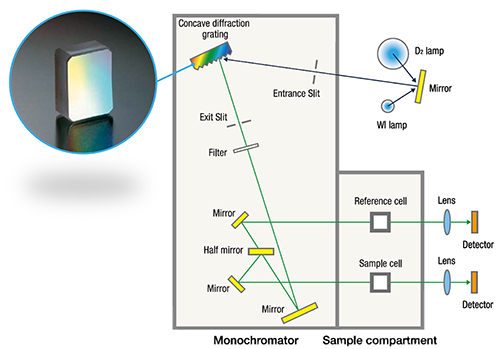 오목 회절격자는 집광과 분산의 양쪽의 기능을 겸비하고 있기 때문에 거울이 적은 광학계를 만들 수 있습니다. 분광 광도계에서는, 사용하는 미러의 매수가 적어지면 광량의 손실이 줄어듦과 동시에, 광로가 짧아져 밝은 광학계가 됩니다. 히타치의 독자적인 룰링 엔진에 의한 회절격자 제작 기술로 수차가 없고 밝은 광학계가 실현됩니다.