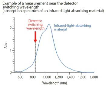 일반적으로 자외선 가시광선 근적외선 분광광도계는 자외선 가시광선 영역과 근적외선 영역에서 다른 검출기를 사용하고 있습니다. 다른 검출기를 이용하고 있기 때문에, 검출기의 전환시에 측광치의 차이가 발생하는 일이 있습니다. UH5700은 원래 쌓아온 노하우나 신호처리 기술 등에 의해 검출기 전환 시의 단차를 최소한으로 억제하고 있습니다.