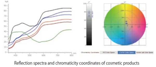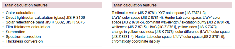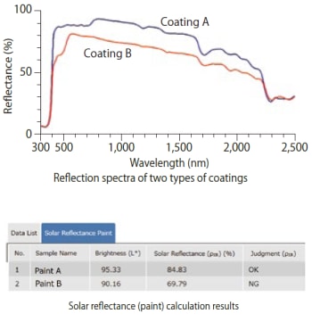 일본 산업 규격(JIS K5602-2008)에 규정되어 있는 도막의 태양광 반사율의 구하는 방법 및 일본 산업 규격(JIS K5675-2011)에 규정되어 있는 지붕용 고태양광 반사율 도료에 관한 시험 방법(태양광 반사율)에 준거한 계산이 가능합니다.