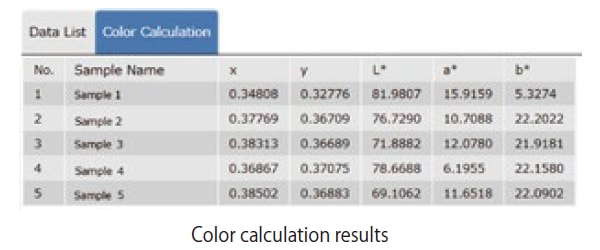 복수 시료 간의 지정 파장 데이터나 면적 계산 데이터, 반값 폭 계산 데이터 등을 표 형식 표시하는 것이 가능하기 때문에 시료 간의 데이터 비교를 용이하게 할 수 있습니다. |
