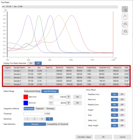 전용 소프트 UV Solutions Plus에서 파장 범위나 검출 방법을 설정할 수 있으며, 복수 샘플을 동시에 검출할 수 있으며, 검출 결과는 표의 형식으로 표시하는 것이 가능합니다.