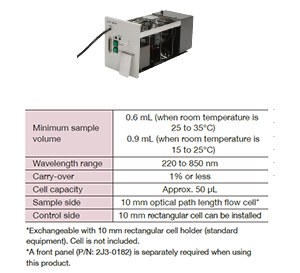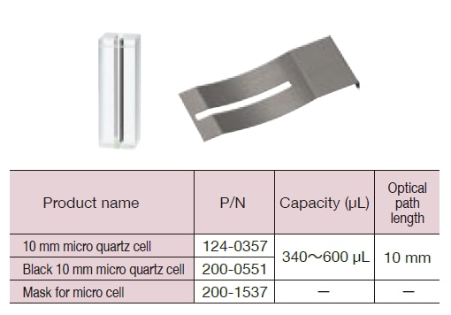 미량(Ultra-Micro)셀은 울트라마이크로셀용 마스크(3J1-0115) (2개들이)를 조합하여 사용합니다. 1.5~90 µL정도의 미량의 샘플 측정에 적합합니다.