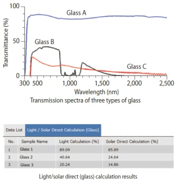 일본 산업 규격(JIS R3106-2019)에 규정되어 있는 판유리의 투과율(반사율)에 관한 시험 방법(가시광 투과율, 태양광 투과율, 태양광 반사율)에 준거한 계산이 가능합니다.